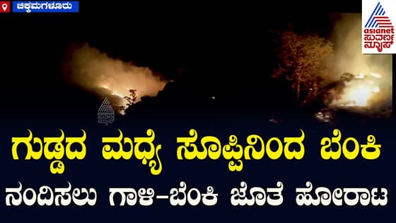 ಚಾರ್ಮಾಡಿ ಘಾಟ್ನಲ್ಲಿ ಗುಡ್ಡದ ಮಧ್ಯೆ ಸೊಪ್ಪಿನಿಂದ ಬೆಂಕಿ ನಂದಿಸಲು ಗಾಳಿ-ಬೆಂಕಿ ಜೊತೆ ಹೋರಾಟ