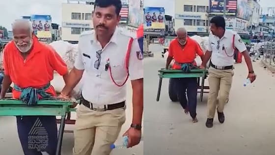 ತುಂಬಿದ ಸರಕಿನ ಗಾಡಿಯನ್ನು ಎಳೆದೊಯ್ಯಲು ಹರಸಾಹಸ ಪಡುತ್ತಿದ್ದ ವಯೋವೃದ್ದನಿಗೆ ಪೊಲೀಸ್ ಪೇದೆ ನೆರವು ನೀಡಿದ್ದಾರೆ
