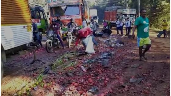 ಲಾರಿ ನಡುವೆ ಅಪಘಾತ : ರಸ್ತೆಯಲ್ಲಿ ಬಿದ್ದ ಹಣ್ಣು ಕೊಂಡೊಯ್ಯಲು ಮುಗಿ ಬಿದ್ದ ಜನ