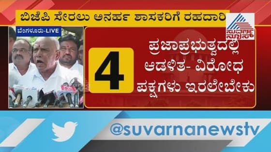 ಬೆಂಗಳೂರು[ನ.13]: ಕಾಂಗ್ರೆಸ್- ಜೆಡಿಎಸ್ ಸಮ್ಮಿಶ್ರ ಸರ್ಕಾರ ಪತನಗೊಳಿಸಿ, ಬಿಜೆಪಿ ಸರ್ಕಾರ ರಚನೆಯಲ್ಲಿ ಪ್ರಮುಖ ಪಾತ್ರ ವಹಿಸಿದ್ದ 17 ಶಾಸಕರು ಉಪಚುನಾವಣೆಯಲ್ಲಿ ಸ್ಪರ್ಧಿಸಬಹುದು ಎಂದು ಸುಪ್ರೀಂಕೋರ್ಟ್ ತೀರ್ಪು ನೀಡಿದೆ. ಈ ತೀರ್ಪಿನಿಂದ ಎಲ್ಲ ಅನರ್ಹ ಶಾಸಕರು ಬಿಜೆಪಿ ಸೇರಲು ಸುಲಭವಾದಂತಾಗಿದೆ. ಇನ್ನು ಬಿಜೆಪಿ ಸರ್ಕಾರದ ರಚನೆಗೆ ಕಾರಣರಾದ ಅನರ್ಹ ಶಾಸಕರ ಬಗ್ಗೆ ಮುಖ್ಯಮಂತ್ರಿ ಯಡಿಯೂರಪ್ಪ ಕೂಡ ಮಾತನಾಡಿದ್ದಾರೆ. ಉಪ ಚುನಾವಣೆಯ ತಯಾರಿ ಬಗ್ಗೆ ವಿವರವಾಗಿ ಹೇಳಿದ್ದಾರೆ.