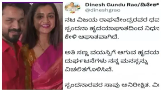 ನಟ ವಿಜಯರಾಘವೇಂದ್ರ ಪತ್ನಿ ಸ್ಪಂದನಾ ನಿಧನ: ಸಂತಾಪ ಸೂಚಿಸಿದ ಸಚಿವ ದಿನೇಶ್ ಗುಂಡೂರಾವ್