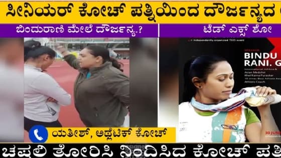 ಬೆಂಗಳೂರು(ಜು.03): ಪ್ರಖ್ಯಾತ ಟಿವಿ ಶೋ ಎನಿಸಿಕೊಂಡಿರುವ ಟೆಡ್ ಎಕ್ಸ್ ಶೋನಲ್ಲಿ ಪಾಲ್ಗೊಳ್ಳಲು ಬಿಂದು ರಾಣಿ ಸುಳ್ಳು ಹೇಳಿದ್ದಾರೆ ಎಂದು ಆರೋಪಿಸಿ ಕಂಠೀರವ ಸ್ಟೇಡಿಯಂನ ಸೀನಿಯರ್ ಕೋಚ್ ಯತೀಶ್ ಅವರ ಪತ್ನಿ, ಏಷ್ಯಾಡ್ ಅಥ್ಲೀಟ್ ಬಿಂದು ರಾಣಿ ಮೇಲೆ ಹಲ್ಲೆಗೆ ಮುಂದಾಗಿದ್ದಾರೆ.