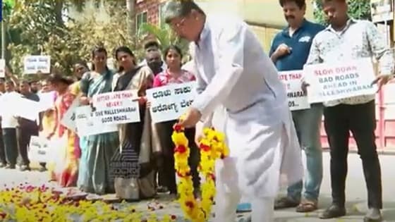 ಸಿಲಿಕಾನ್ ಸಿಟಿಯಲ್ಲಿ ಗುಂಡಿಗಳಿಗೆ ಬ್ರೇಕ್ ಬೀಳುತ್ತಿಲ್ಲ. ಅರ್ಧಂಬರ್ಧ ಕಾಮಗಾರಿಯಿಂದ ಜನ ಬೇಸತ್ತಿದ್ದಾರೆ. ಮಲ್ಲೇಶ್ವರಂನಲ್ಲಿ ಜನ ವಿನೂತನ ಪ್ರತಿಭಟನೆ ನಡೆಸಿದ್ದಾರೆ. ರಸ್ತೆ ಗುಂಡಿಗಳಿಗೆ ಪೂಜೆ ಮಾಡಿ, ಹೂವಿನ ಹಾರಗಳನ್ನು ಹಾಕಿ ಪ್ರತಿಭಟಿಸಿದ್ದಾರೆ.