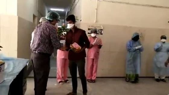 ಬೆಂಗಳೂರು (ಏ. 12): ಕೊರೋನಾ ಬಗ್ಗೆ ಬೇಸರದ ಸುದ್ದಿಯ ನಡುವೆಯೇ ಗುಡ್ ನ್ಯೂಸ್ವೊಂದಿದೆ. ಚಿಕ್ಕಬಳ್ಳಾಪುರದಲ್ಲಿ ಕೊರೋನಾ ಸೋಂಕಿತರು ಗುಣಮುಖರಾಗಿದ್ದು ಆಸ್ಪತ್ರೆಯಿಂದ ಡಿಸ್ಚಾರ್ಜ್ ಆಗಿದ್ದಾರೆ. ವೈದ್ಯಕೀಯ ಸಿಬ್ಬಂದಿ ಗಿಡ, ಹಣ್ಣುಗಳನ್ನು ಕೊಟ್ಟು ಚಪ್ಪಾಳೆ ತಟ್ಟಿ ಅವರನ್ನು ಬೀಳ್ಕೊಟ್ಟಿದ್ದಾರೆ.