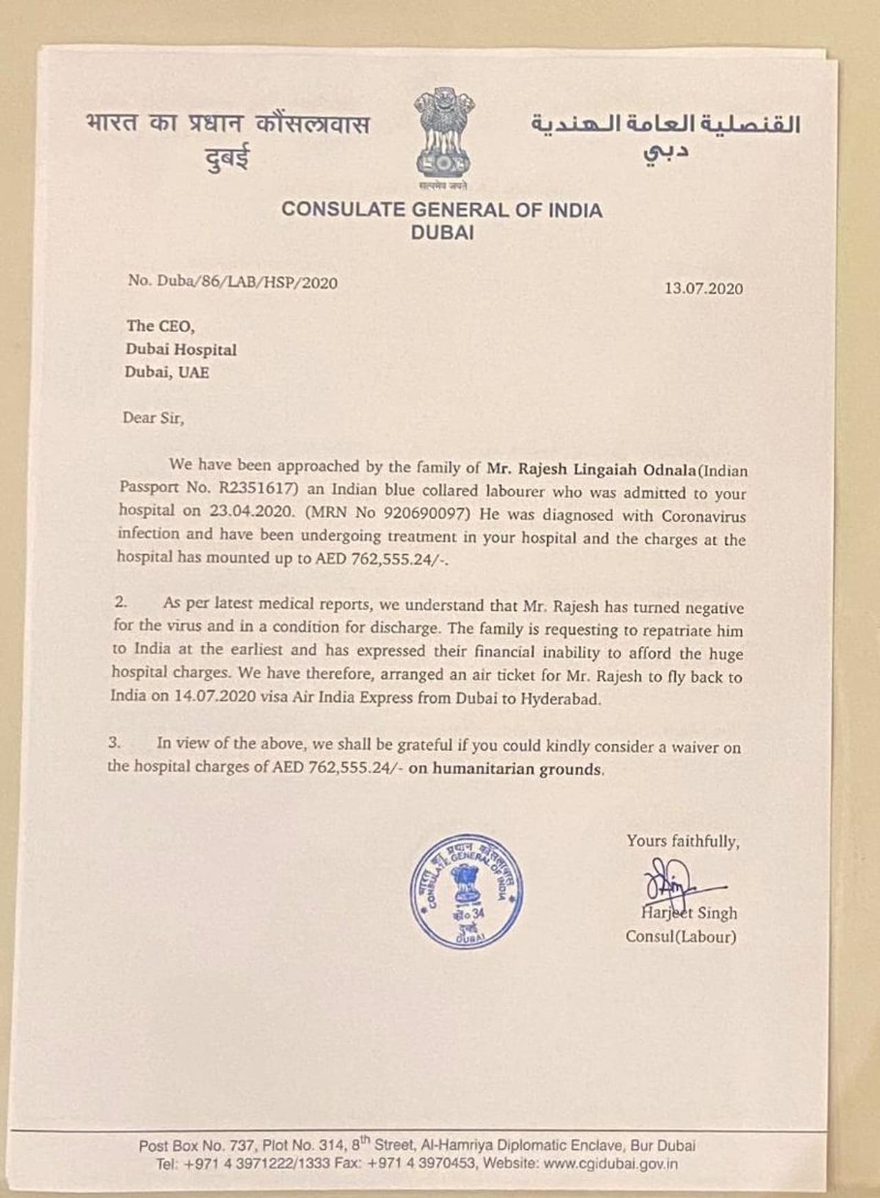 ಬಡ ಕೂಲಿ ಕಾರ್ಮಿಕ ರಾಜೇಶ್ ಅವರಿಗೆ ನೆರವು ನೀಡಬೇಕು ಎಂದು ನರಸಿಂಹ ಅವರು ದುಬೈನಲ್ಲಿರುವ ಇಂಡಿಯನ್ ಕನ್ಸೊಲೆಟ್ ಸುಮಾ ರೆಡ್ಡಿ ಅವರ ಗಮನಕ್ಕೆ ತರಲಾಗಿತ್ತು. ಈ ವಿಚಾರ ತಿಳಿದ ಭಾರತೀಯ ಕಾರ್ಮಿಕರ ಕನ್ಸೊಲೆಟ್ ದುಬೈ ಮುಖ್ಯಸ್ಥ ಹರ್ಜೀತ್ ಸಿಂಗ್, ಕಾರ್ಮಿಕ ರಾಜೇಶ್ ದಾಖಲಾಗಿದ್ದ ಆಸ್ಪತ್ರೆಗೆ ಪತ್ರ ಬರೆದಿದ್ದಾರೆ. ಬಡ ಕೂಲಿ ಕಾರ್ಮಿಕ ಆಗಿರುವ ಕಾರಣ ಮಾನವೀಯತೆಯ ದೃಷ್ಟಿಯಲ್ಲಿ ರಾಜೇಶ್ ಅವರ ಆಸ್ಪತ್ರೆ ವೆಚ್ಚ ಮನ್ನ ಮಾಡುವಂತೆ ಮನವಿ ಮಾಡಿದ್ದರು.