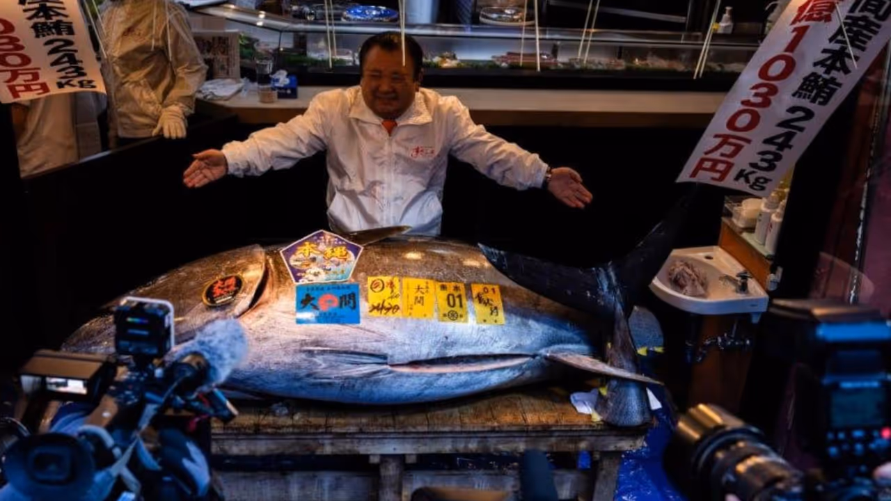 Giant Bluefin Tuna Sold for Record ₹29 Crore at Tokyo Fish Auction ಜಪಾನ್ನ ಟೋಕಿಯೋದಲ್ಲಿ 243 ಕೆಜಿಯ ಬೃಹತ್ ಮೀನು ಬರೋಬ್ಬರಿ 29 ಕೋಟಿಗೆ ಮಾರಾಟವಾಗಿದೆ. ಇದೇ ಮೀನು ಶಾಪ್ಗಳಲ್ಲಿ ಪ್ರತಿ ಕೆಜಿಗೆ 11 ಲಕ್ಷ ರೂಪಾಯಿಯಂತೆ ಮಾರಾಟವಾಗಿದೆ.