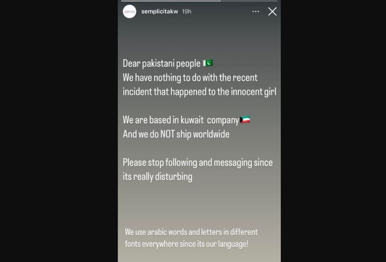 ಈ ವಿಚಾರಕ್ಕೆ ಸಂಬಂಧಿಸಿದಂತೆ ಈಗ ಪ್ರತಿಕ್ರಿಯೆ ನೀಡಿರುವ ಈ ಮಹಿಳೆ ಧರಿಸಿದ್ದ ಕುರ್ತಾ ವಿನ್ಯಾಸ ಮಾಡಿದ್ದ ಕುವೈತ್ ಮೂಲದ ವಸ್ತ್ರ ವಿನ್ಯಾಸ ಸಂಸ್ಥೆ 'ಸಿಂಪ್ಲಿಸಿಟKW' ಈ ಬಗ್ಗೆ ಸ್ಪಷ್ಟನೆ ನೀಡಿ ಪಾಕಿಸ್ತಾನಿ ಜನರ ಅನಕ್ಷರತೆ ಹಾಗೂ ಮತಾಂಧತೆ ಬಗ್ಗೆ ತೀವ್ರ ಆಕ್ರೋಶ ವ್ಯಕ್ತಪಡಿಸಿದೆ. ಪ್ರಿಯ ಪಾಕಿಸ್ತಾನ ಜನರೇ , ಇತ್ತೀಚೆಗೆ ಅಮಾಯಕ ಮಹಿಳೆಯೊಬ್ಬರಿಗೆ ಪಾಕಿಸ್ತಾನದಲ್ಲಿ ನಡೆದ ಅವಮಾನಕಾರಿ ಘಟನೆಯ ಬಗ್ಗೆ ನಮ್ಮಿಂದ ಏನು ಮಾಡಲಾಗಲಿಲ್ಲ, ನಮ್ಮದು ಕುವೈತ್ ಮೂಲದ ವಸ್ತ್ರ ವಿನ್ಯಾಸ ಸಂಸ್ಥೆಯಾಗಿದ್ದು, ಪ್ರಪಂಚದೆಲ್ಲೆಡೆ ನಾವು ಸೇವೆ ಒದಗಿಸುತ್ತಿಲ್ಲ, ನಮ್ಮನ್ನು ಫಾಲೋ ಮಾಡಬೇಡಿ ಈ ಘಟನೆ ತುಂಬಾ ಬೇಸರ ತರಿಸಿದೆ. ಅರೇಬಿಕ್ ನಮ್ಮ ಭಾಷೆಯಾಗಿರುವುದರಿಂದ ಬಹಳ ಹಿಂದಿನಿಂದಲೂ ನಾವು ಆ ಭಾಷೆಯನ್ನು ನಮ್ಮ ಬಟ್ಟೆಗಳ ವಿನ್ಯಾಸದಲ್ಲಿ ಬಳಸುತ್ತೇವೆ ಎಂದು ತನ್ನ ಪ್ರಕಟಣೆಯಲ್ಲಿ ತಿಳಿಸಿದೆ.