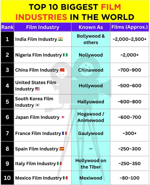 ವಿಶ್ವದ ಟಾಪ್ 10 ಅತಿದೊಡ್ಡ ಸಿನಿಮಾ ಇಂಡಸ್ಟ್ರಿಗಳು: ಭಾರತದ ಸ್ಥಾನ ಎಲ್ಲಿದೆ? ಇಲ್ಲಿವೆ ನೋಡಿ ರೋಚಕ ಮಾಹಿತಿಗಳು!