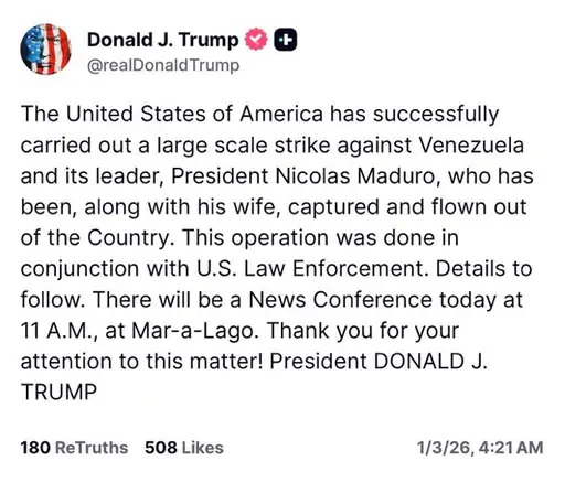 ತಮ್ಮ ಟ್ರೂತ್ ಸೋಶಿಯಲ್ನಲ್ಲಿ ಪೋಸ್ಟ್ ಮಾಡಿದ ಅಧ್ಯಕ್ಷ ಟ್ರಂಪ್, ಅಮೆರಿಕವು "ವೆನುಜುವೇಲ ಮತ್ತು ಅದರ ನಾಯಕನ ವಿರುದ್ಧ ದೊಡ್ಡ ಪ್ರಮಾಣದ ದಾಳಿಯನ್ನು ಯಶಸ್ವಿಯಾಗಿ ನಡೆಸಿದೆ" ಎಂದು ಹೇಳಿದರು, ಅಮೆರಿಕದ ಕಾನೂನು ಜಾರಿ ಸಂಸ್ಥೆಗಳ ಜೊತೆಗೆ ನಡೆಸಿದ ಕಾರ್ಯಾಚರಣೆಯಲ್ಲಿ ಮಡುರೊ ಮತ್ತು ಅವರ ಪತ್ನಿಯನ್ನು ವಶಕ್ಕೆ ತೆಗೆದುಕೊಂಡು ದೇಶದಿಂದ ಹೊರಗೆ ಕಳುಹಿಸಲಾಯಿತು ಎಂದಿದ್ದಾರೆ. ಹೆಚ್ಚಿನ ವಿವರಗಳನ್ನು ಮಾರ್-ಎ-ಲಾಗೊದಲ್ಲಿ ಬೆಳಿಗ್ಗೆ 11 ಗಂಟೆಗೆ ನಿಗದಿಯಾಗಿರುವ ಸುದ್ದಿಗೋಷ್ಠಿಯಲ್ಲಿ ಹಂಚಿಕೊಳ್ಳಲಾಗುವುದು ಎಂದು ಅವರು ತಿಳಿಸಿದ್ದಾರೆ.
