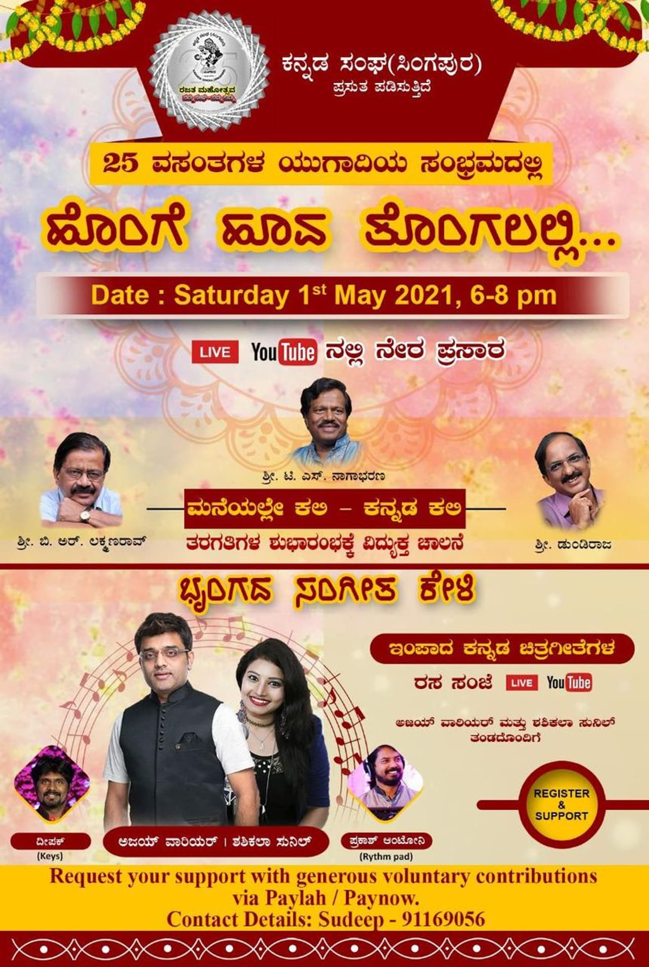 ಸಿಂಗಾಪುರದಲ್ಲಿ ಯುಗಾದಿ ಉತ್ಸವ/ ಮೇ 1 ರಂದು 'ಹೊಂಗೆ ಹೂವ ತೊಂಗಲಲ್ಲಿ' / ಕಲಿ-ಕನ್ನಡ ಕಲಿ online ತರಗತಿಗಳಿಗೆ ಚಾಲನೆ/ ಅಜಯ್ ವಾರಿಯರ್ ಮತ್ತು ಶಶಿಕಲಾ ಅವರಿಂದ ಸಂಗೀತ ರಸಸಂಜೆ.